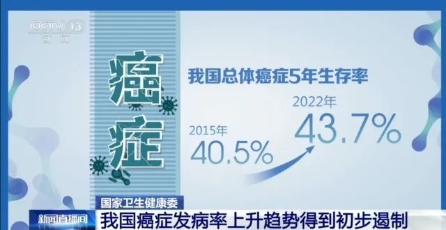 我國總體癌癥5年生存率由2015年的40.5%上升至2022年的43.7%。根據健康中國癌癥防治專項行動要求,到2030年,我國總體癌癥5年生存率將達到46.6%的主要目標,患者疾病負擔得到有效的控制。